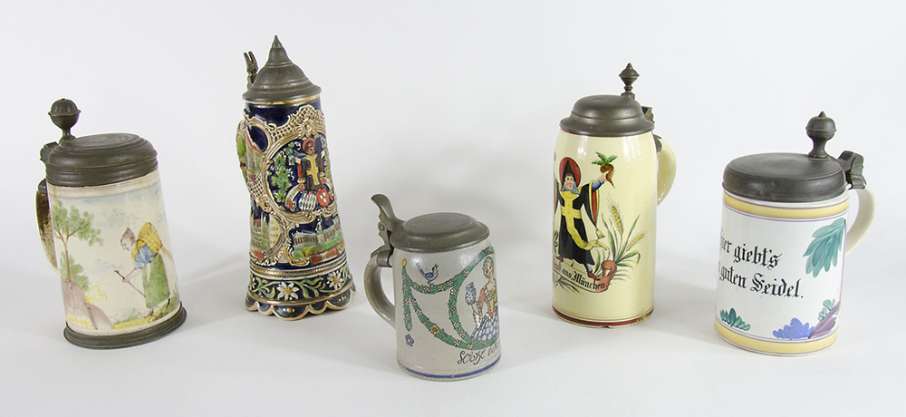 Lot 134 | Lotto di 5 krughel in ceramica policroma con coperchi in peltro. H. max cm....