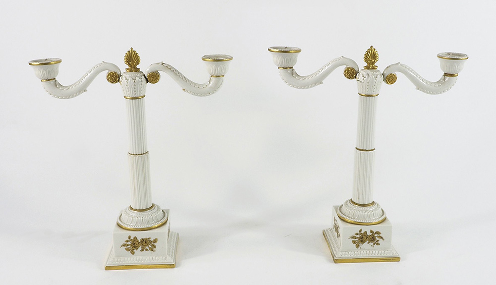Paio di candelabri in porcellana bianca con decori dorati. H. cm. 32. (restauro).