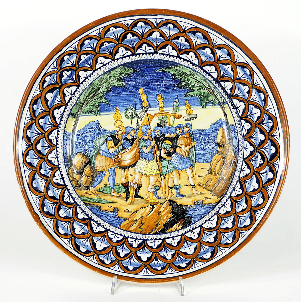 Giuliano Smacchia per L'Eredità. Grande piatto in ceramica policroma dipinto al centro con figure di guerrieri. Diam. cm. 43.