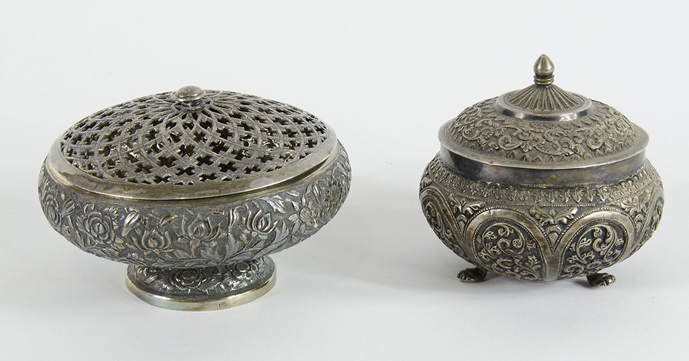 Lotto composto da 2 antiche scatole rotonde in argento con coperchi, lavorate a sbalzo.