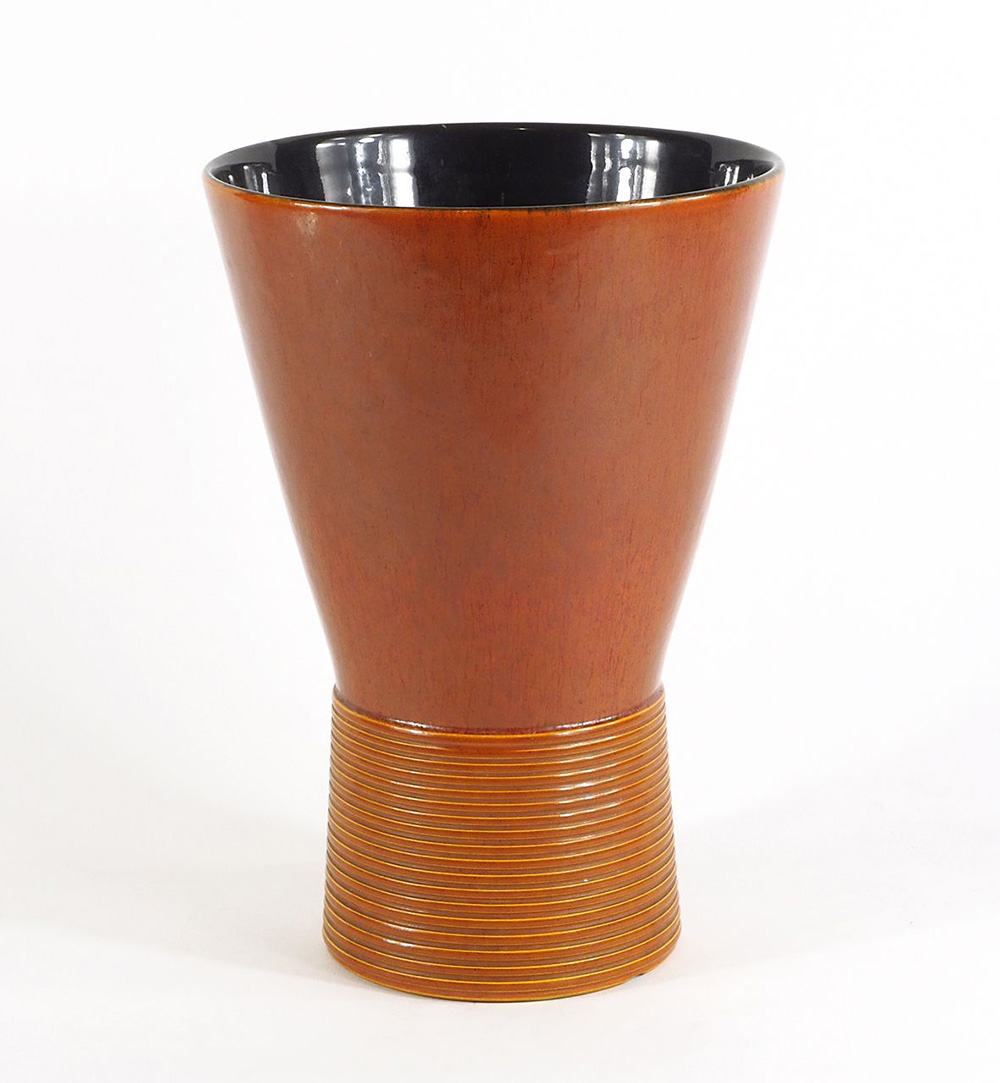 Lavenia: vaso in ceramica policroma arancio con interno nero. Disegno di G. Andlovitz. Marcato sotto la base. H. cm. 27. (difetto).