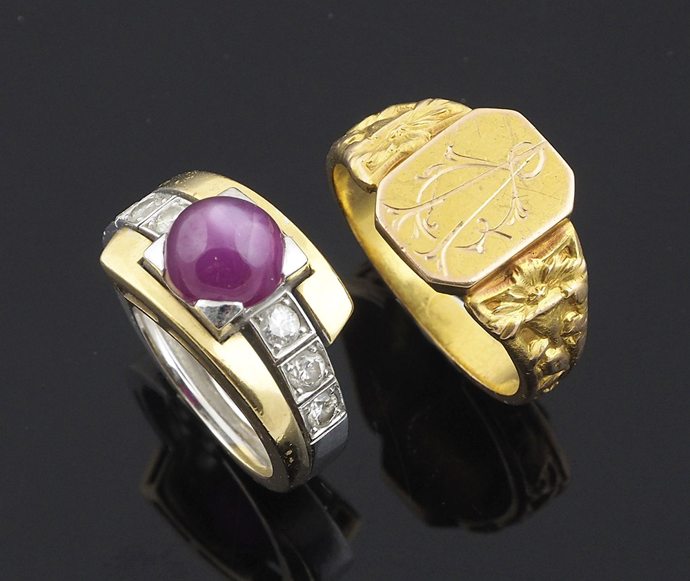 Lot 305 | Lotto composto da 2 anelli, uno in oro giallo con incisioni, l'altro in oro...
