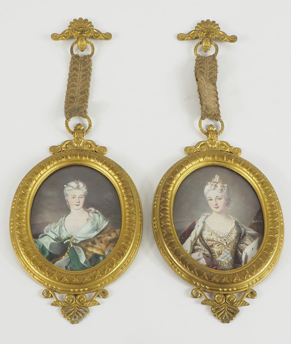 Maestro del XIX secolo Lotto di 2 piccoli dipinti ovali su rame raffiguranti gentildonne, entro cornici in bronzo dorato. tot cm. 17x10.