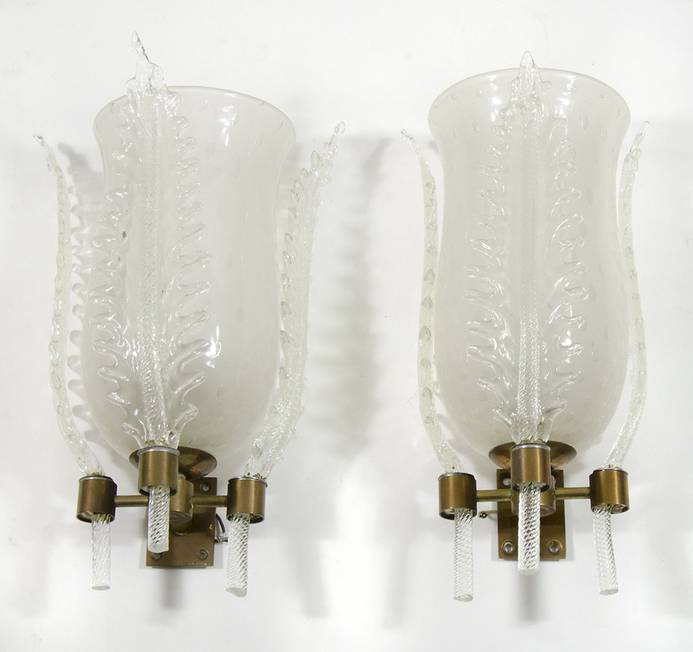 Coppia di appliques in vetro di Murano con applicazioni di foglie. H. cm. 30.