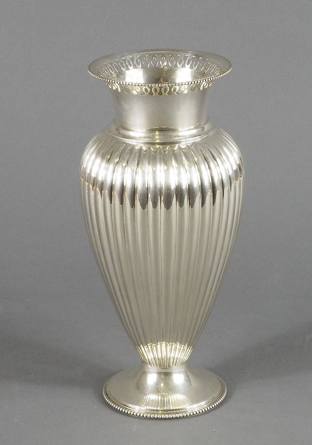 Vaso ad anfora in argento lavorato a coste verticali e bordo traforato. H....