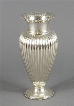 Vaso ad anfora in argento lavorato a coste verticali e bordo traforato. H. cm. 22,5. gr. 400.