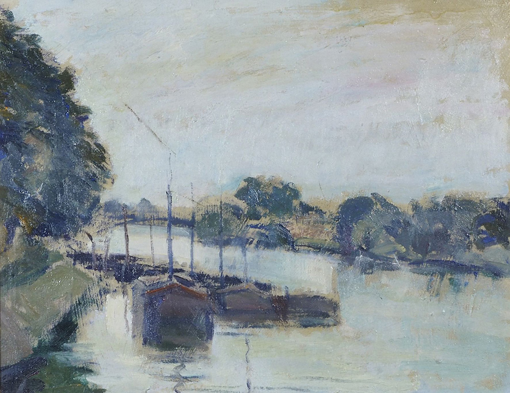 Enrico Fonda Fiume 1892-Parigi 1929 "Barche sulla Senna" cm. 38x48 - olio su cartone Al retro timbro di provenienza.