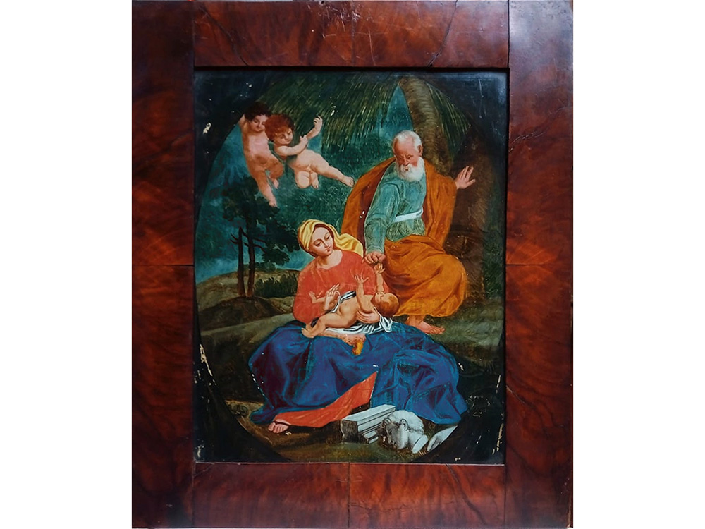 Maestro del XVIII secolo Sacra famiglia 32,5x26,5 cm Olio su vetro