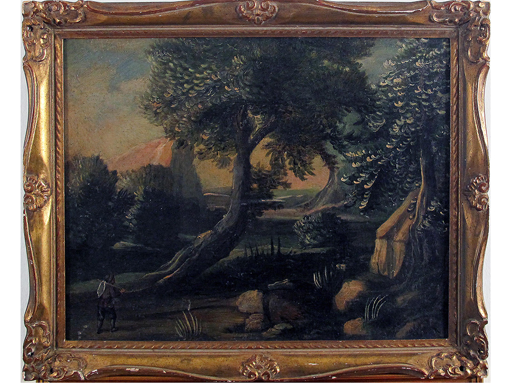 Anonimo (XVIII secolo) Paesaggio con viandante 40x50 cm Olio su tela applicata a faesite