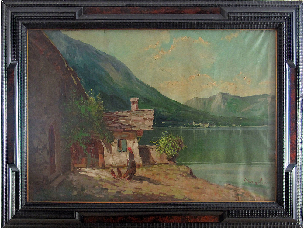 Mazzolani (XX secolo) Paesaggio lacustre con figura e galline 70x100 cm Olio...