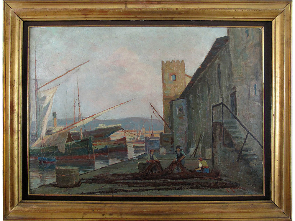 Renuccio Renucci (1880–1947) Pescatori nel porto 50x70 cm Olio su cartoncino