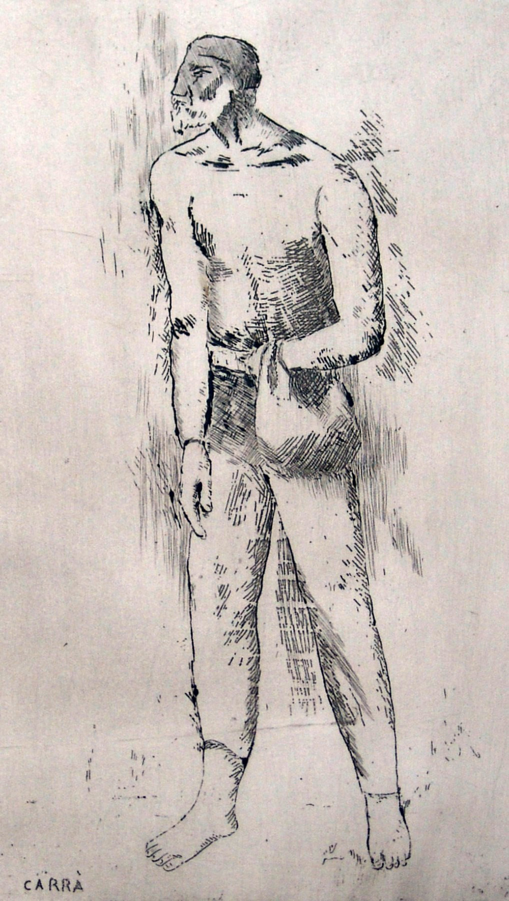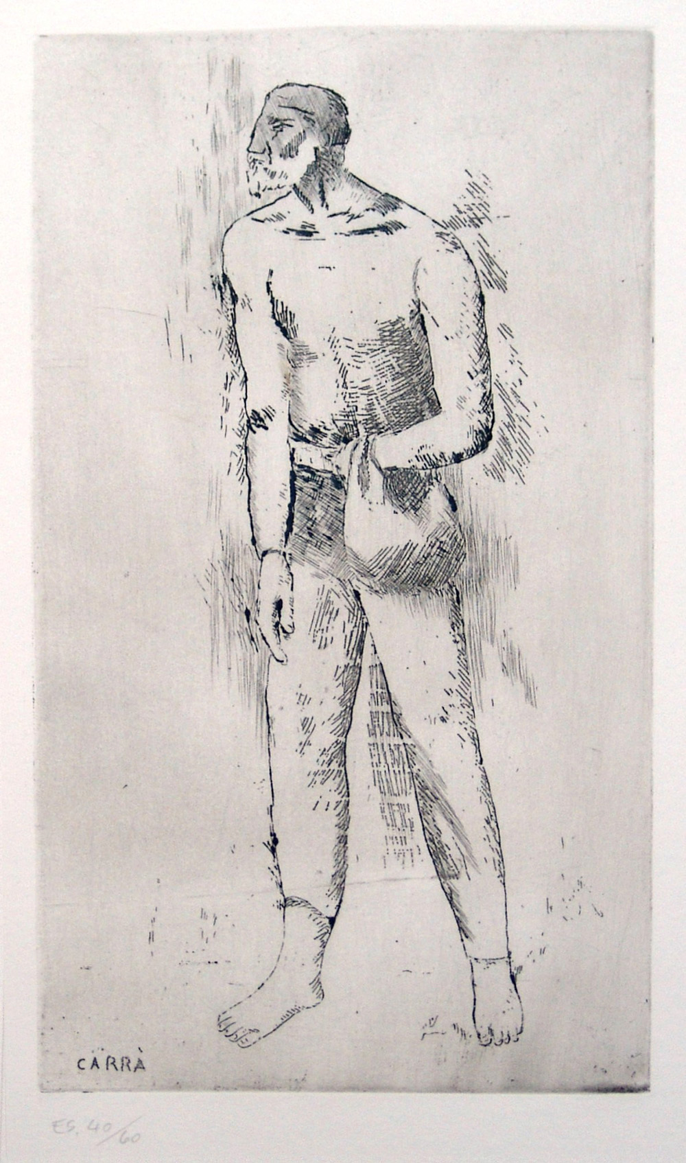 Carlo Carrà 1881, Quargnento (Al) - 1966, Milano (Mi) - [Italia] Il viandante acquaforte 53x38 cm 1971 es. 40/60; firma dell'artista sulla lastra incisa nel 1924; f.to incisione 31,1x17 cm; Editore Luigi De Tullio; opera con cornice autentica di Massimo Carrà sul retro con timbro dello Studio Carrà