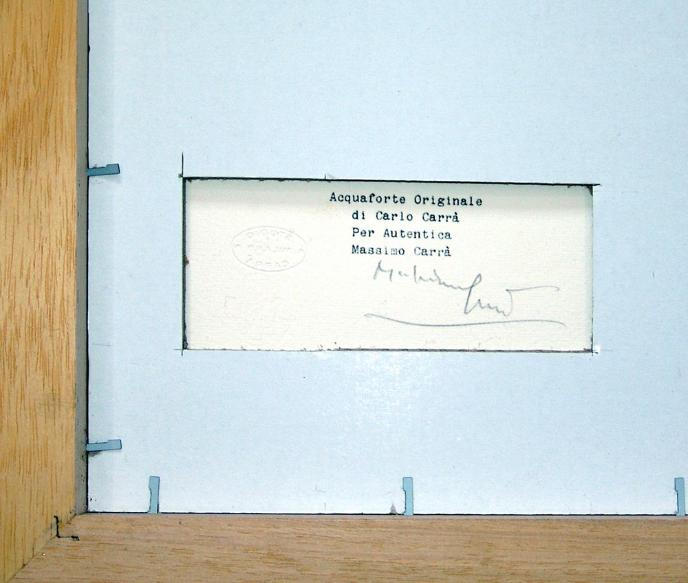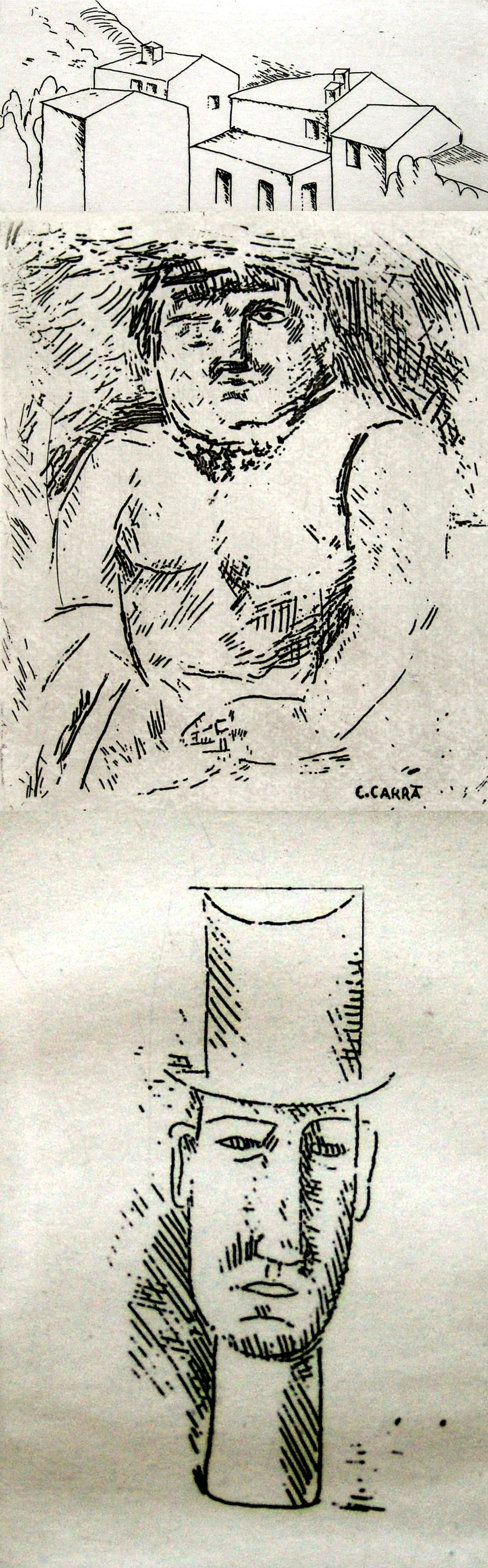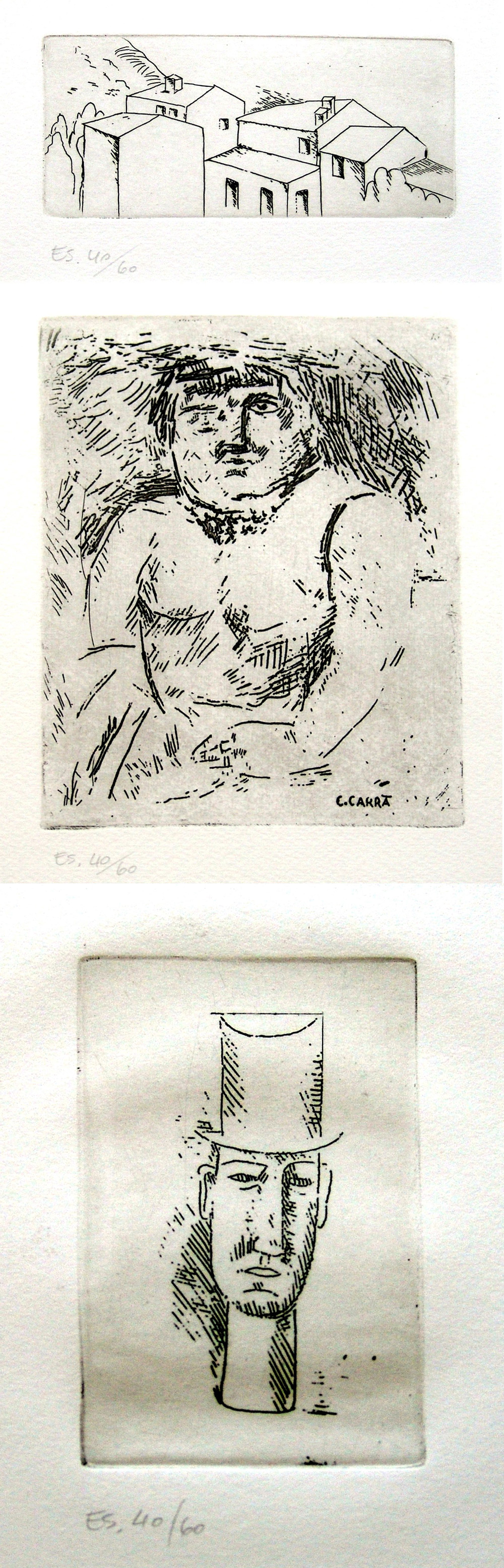 Carlo Carrà 1881, Quargnento (Al) - 1966, Milano (Mi) - [Italia] Case a Belgirate, Donna alla Scala, Testa di gentiluomo (lotto unico con tre opere) acquaforte 53x38 cm cad. 1971 es. 40/60; lastre incise nel 1922; f.to incisioni 5,8x12,4 cm, 16,9x14,1 cm, 13x7,9 cm; Editore Luigi De Tullio; opere con cornice autentica di Massimo Carrà sul retro con timbro dello Studio Carrà