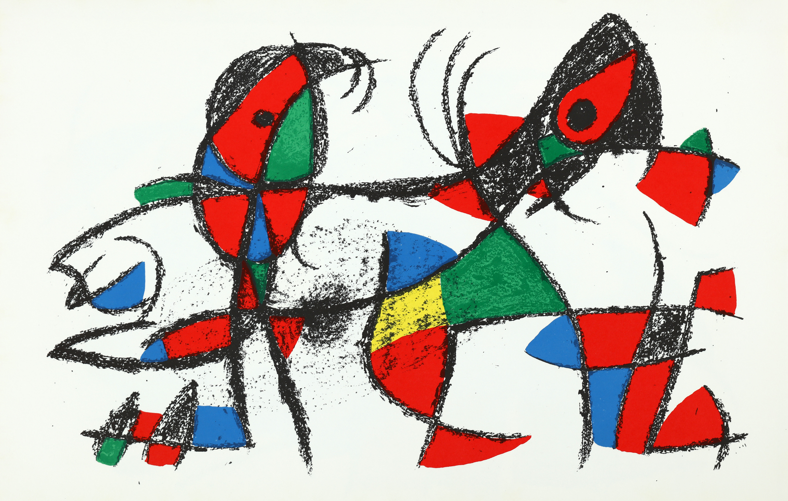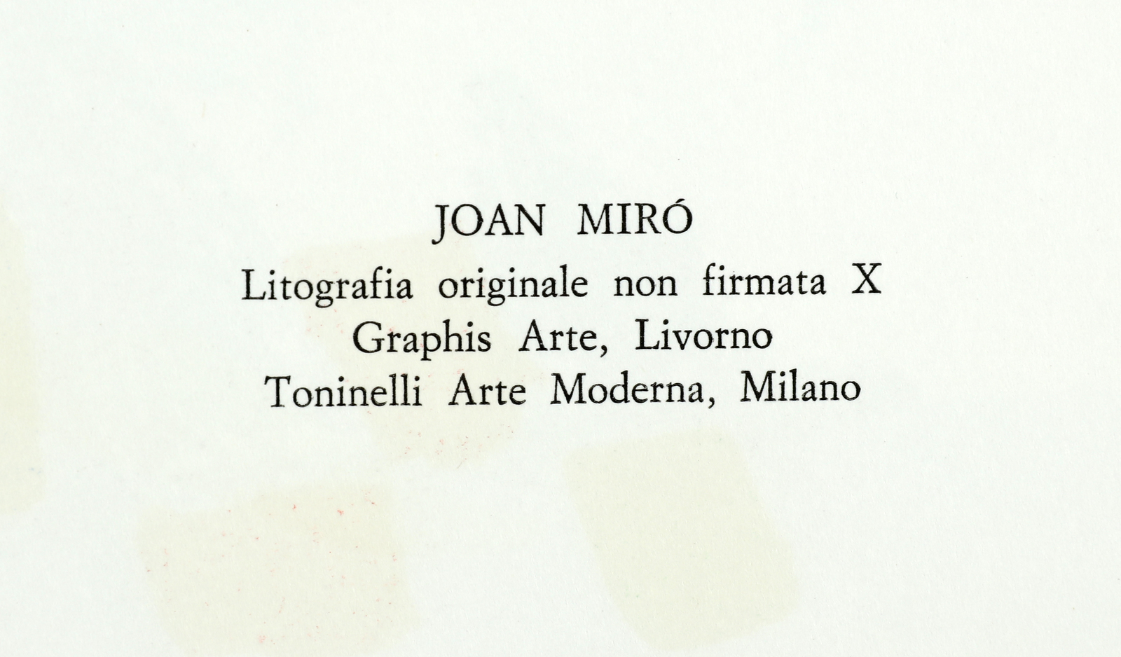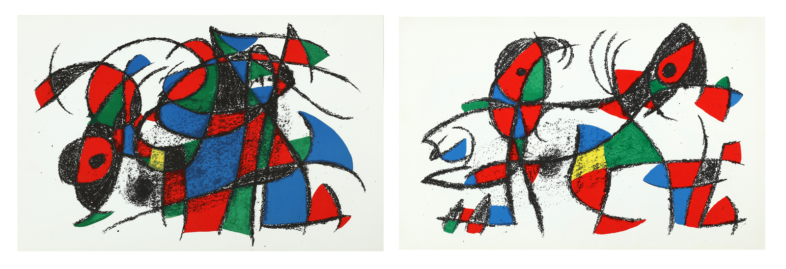 MIRO' JOAN (1893 - 1983) Lot composed of 2 sheets. Lithograph. Cm 52,00 x 34,00. At the back Graphis Arte, Livorno - Toninelli Modern Art, Milan guarantee stamp.