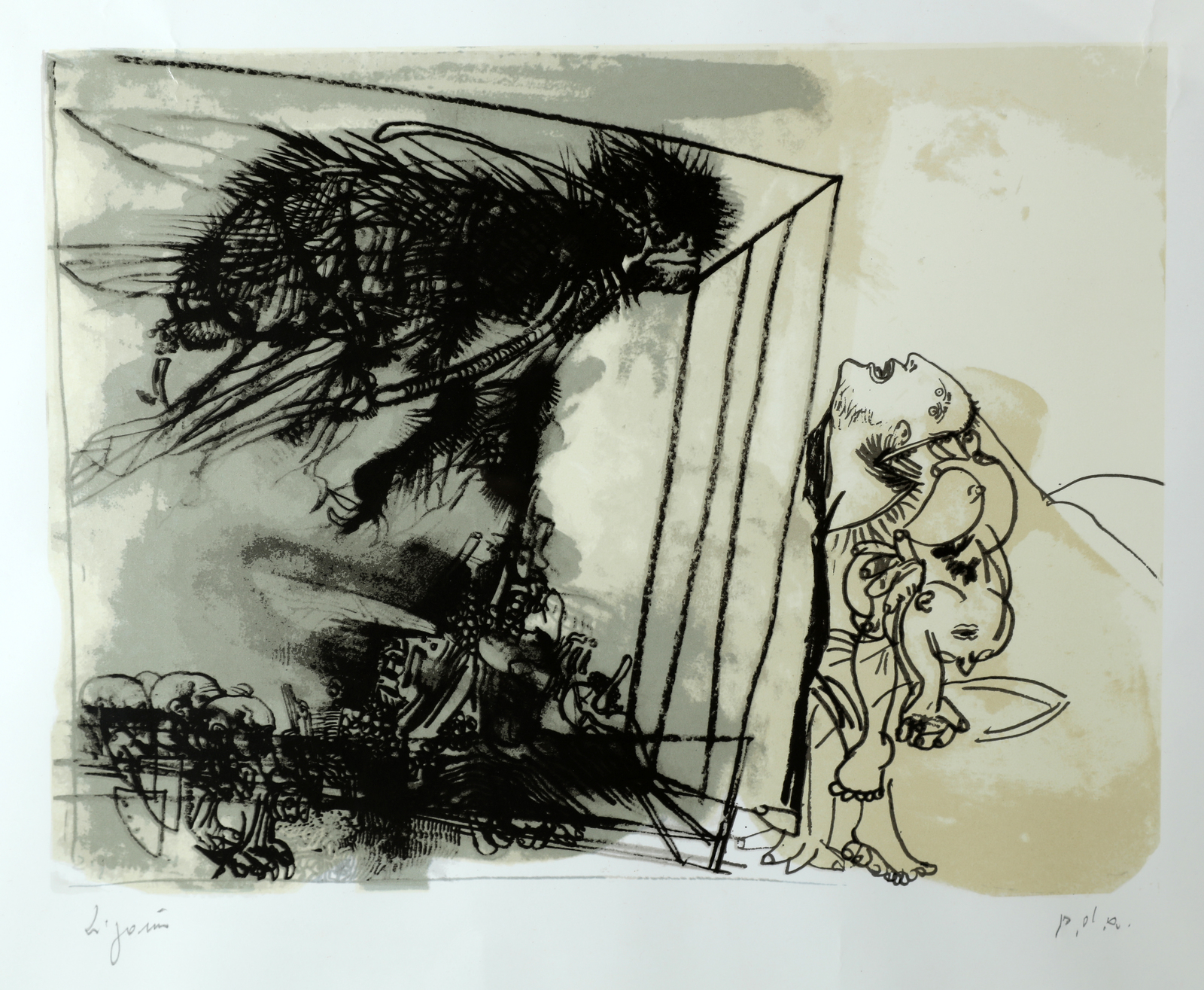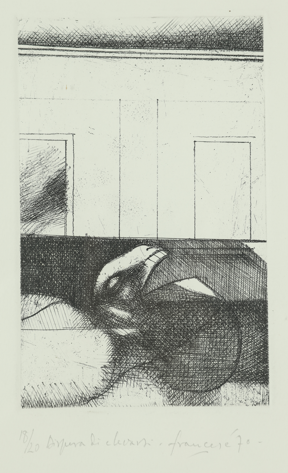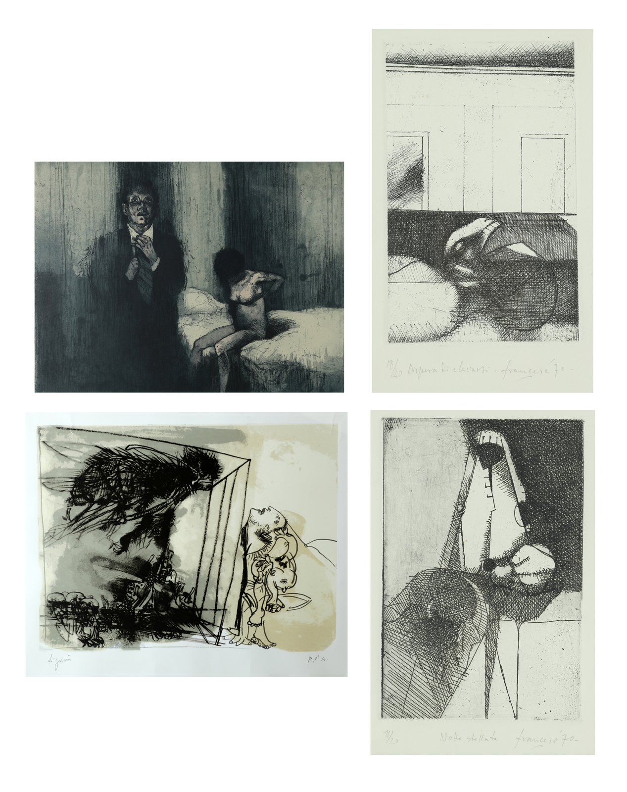 ARTISTI VARI Lotto composto da n.4 fogli. Grafica. . 1. Francese: 11/20, Notte stellata, 44x24 cm, tiratura, firma, titolo e anno a matita in basso, acquaforte;. Dimensione lastra: 13x20 cm. 1970. 2. Francese: 18/20, Dispera di elevarsi, 44x24 cm, tiratura, firma, titolo e anno a matita in basso, acquaforte. Dimensione lastra: 13x20 cm. 1970. 3. Sughi: 90/100. Nella camera, 68x85 cm, acquaforte, tiratura e firma a matita in basso; Torcular edizioni, dimensione lastra: 50x65 cm. 4. Zigaina: P.d.a. Senza titolo, litografia.90x70 cm, tiratura e firma a matita in basso. Cornice presente