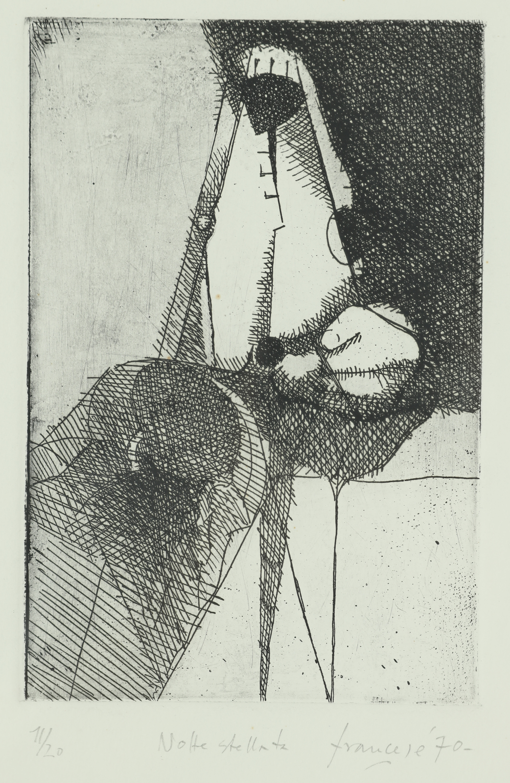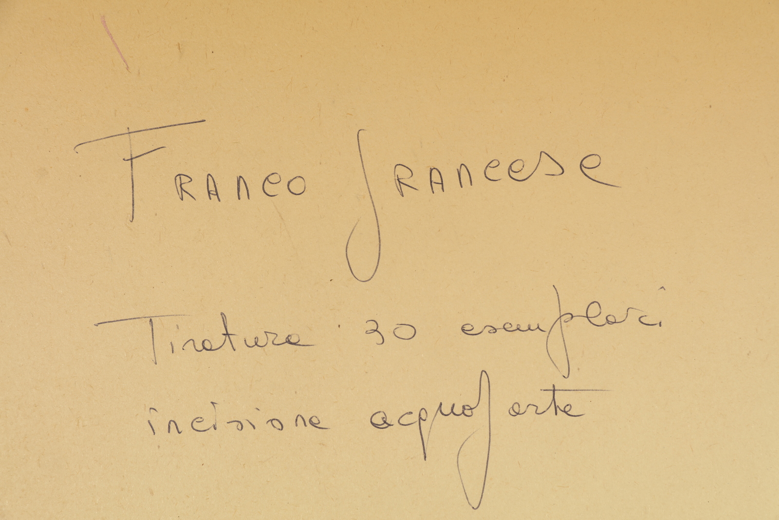 ARTISTI VARI Lot composed of 4 sheets. Graphics. . 1. Francese: 11/20. Starry night, 44x24 cm, edition, signature, title and year lower in pencil. Plate size: 13x20 cm. 1970. 2. Francese: 18/20. Untitled, 44x24 cm, edition, signature, title and year lower in pencil. Plate size: 13x20 cm. 1970. 3. Sughi: 90/100. In the room, 68x85 cm, edition and signature lower in pencil; Torcular edition, plate size: 50x65 cm. 4. Zigaina: P.d.a, Untitled, 90x70 cm, edition and signature lower in pencil. Cornice presente