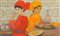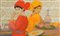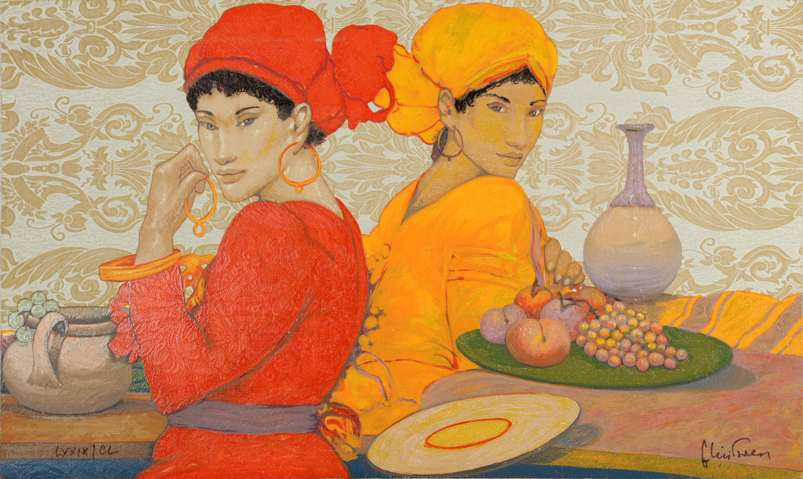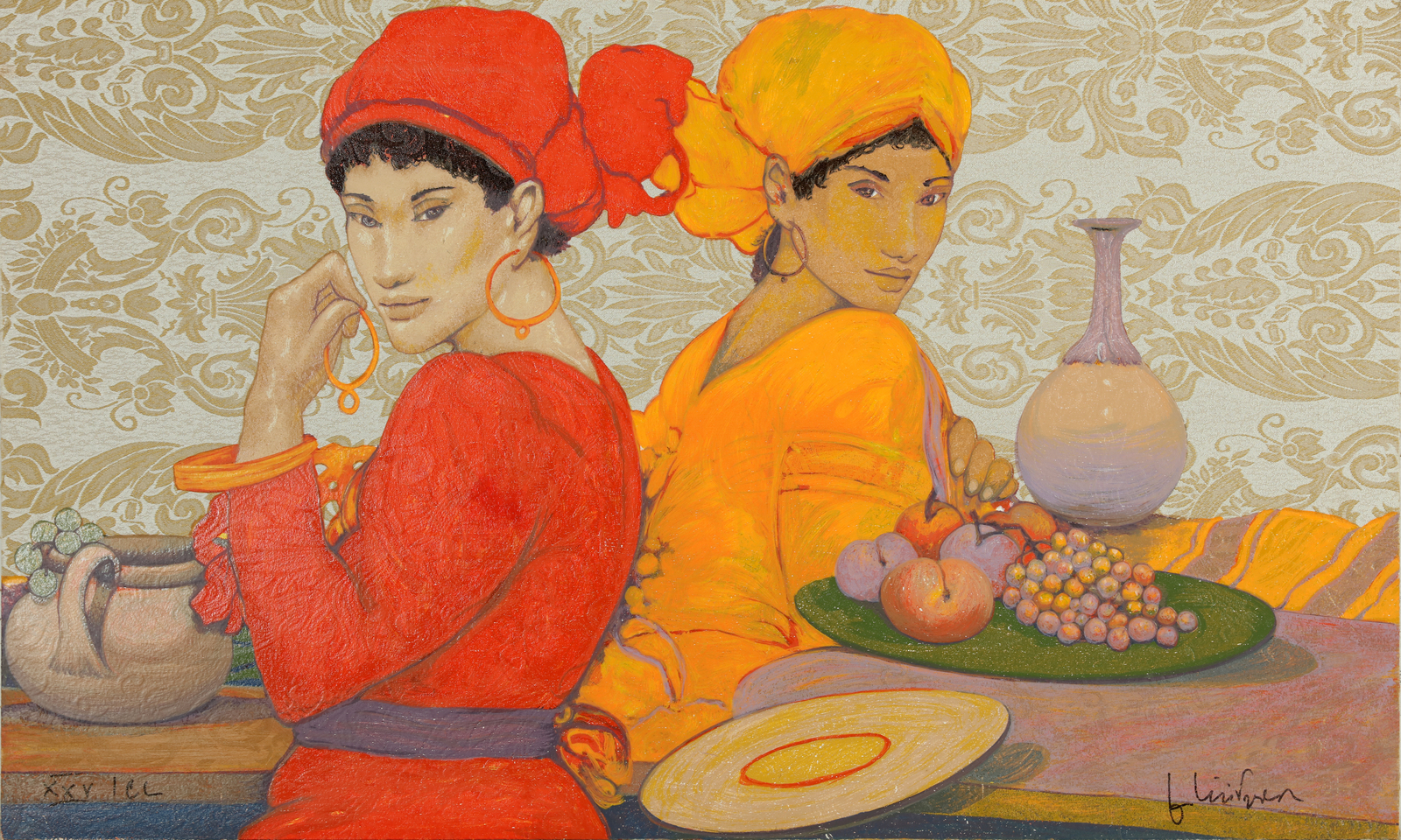 CIVITARESE GOFFREDO (n. 1936) Lot composed of 2 graphic. Women with still life. Silkscreen print on brocade. Cm 60,00 x 100,00. LXXIX/CL; XXV/CL. Edition and signature lower. At the back Nuovo Segno art Gallery label.