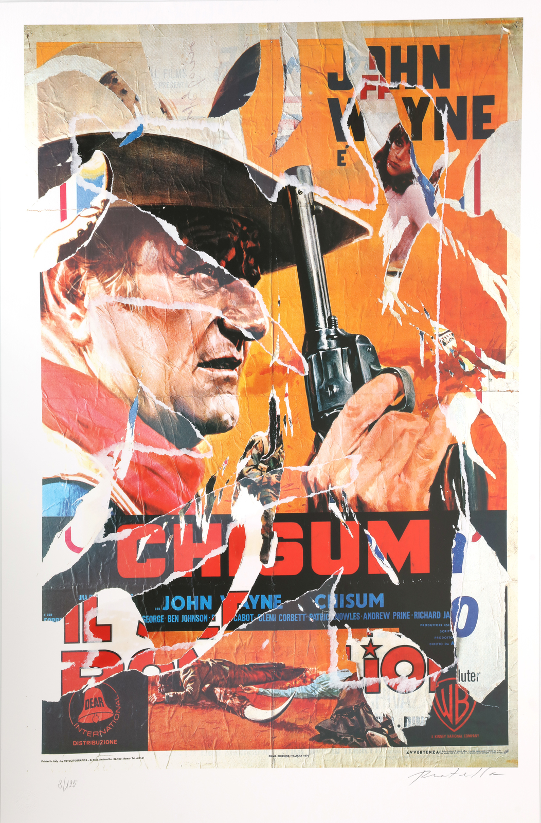ROTELLA MIMMO (1918 - 2006) Chisum. Litografia. Cm 70,00 x 100,00. 8/125. Tiratura e firma a matita in basso. Timbro a secco Fondazione Mimmo Rotella, Milano in basso a sinistra. Pubblicazione: Mimmo Rotella multiples décollages a cura di Elena Pontiggia, Silvana Editoriale, pag. 60-61.