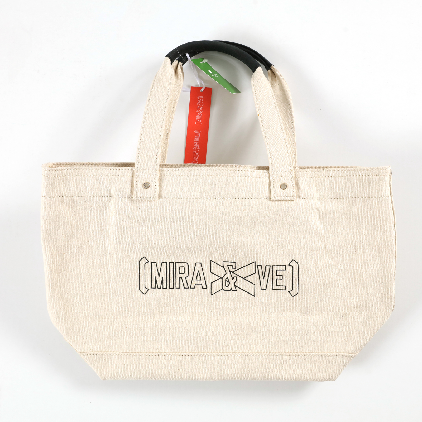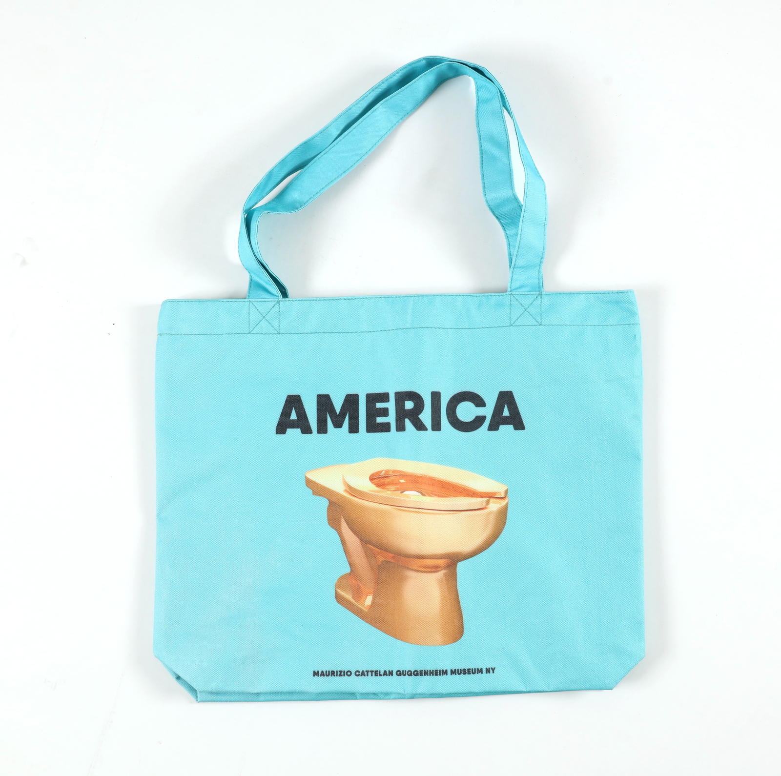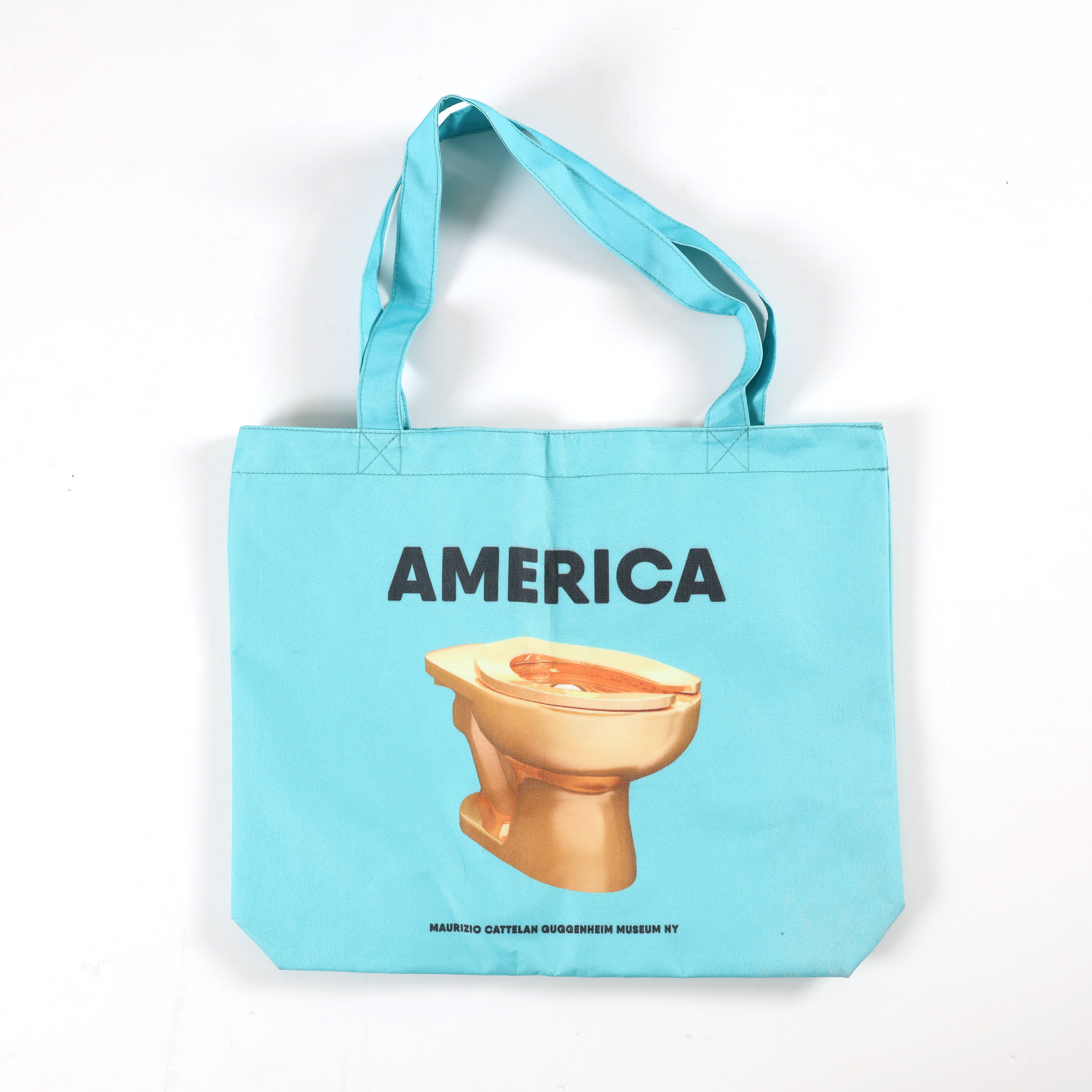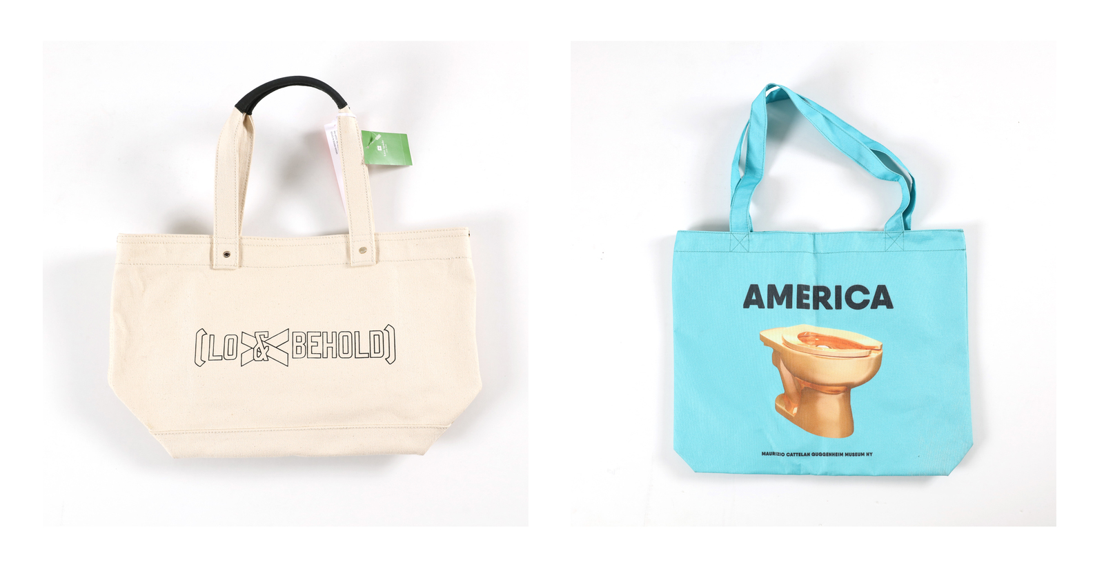 ARTISTI VARI Lot composed of 2 shopping bag. Fabric. Cm 47,00 x 37,00. 1. Maurizio Cattelan, America; For Guggenheim Museum, New York.