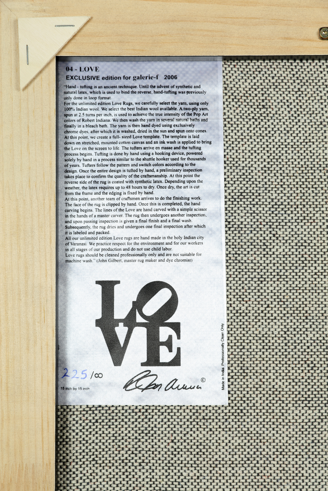 INDIANA ROBERT (n. 1928) 04 - LOVE. Tappeto. Cm 39,00 x 39,00. N.225. Al retro cartiglio descrittivo Galerie - F con tiratura e firma a stampa. Edizione esclusiva per Galerie - F, Kranenburg, 2006.