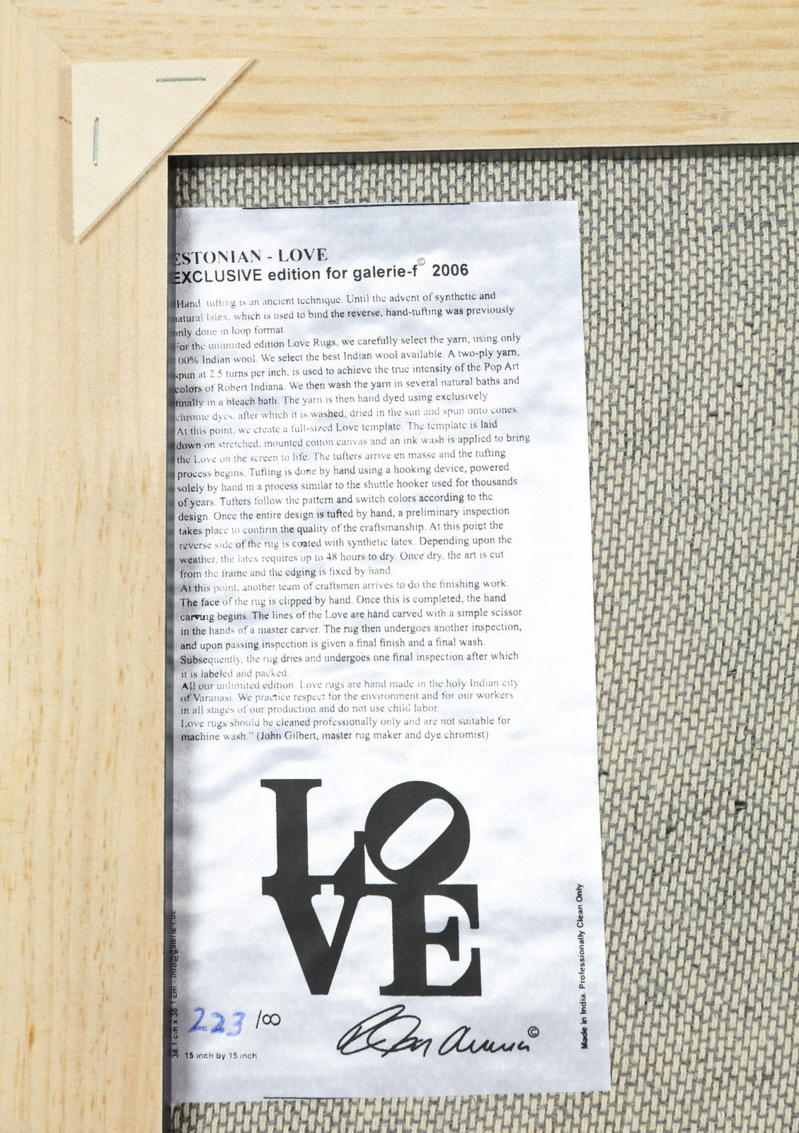 INDIANA ROBERT (n. 1928) Estonian - LOVE. Carpet. Cm 39,00 x 39,00. N.223. At the back Galerie - F label with edition and signature in print. Exlusive edition for Galerie - F, Kranenburg, 2006.
