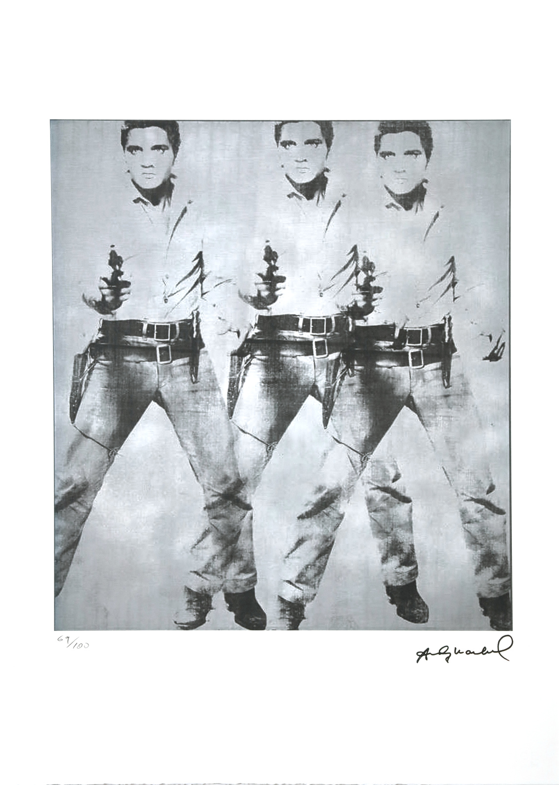 2.Triple Elvis. 81/100. Edition lower left in pencil and signature lower right in print. Arches paper, France; George Israel, Paris samps. At the back Leo Castelli New York stamps