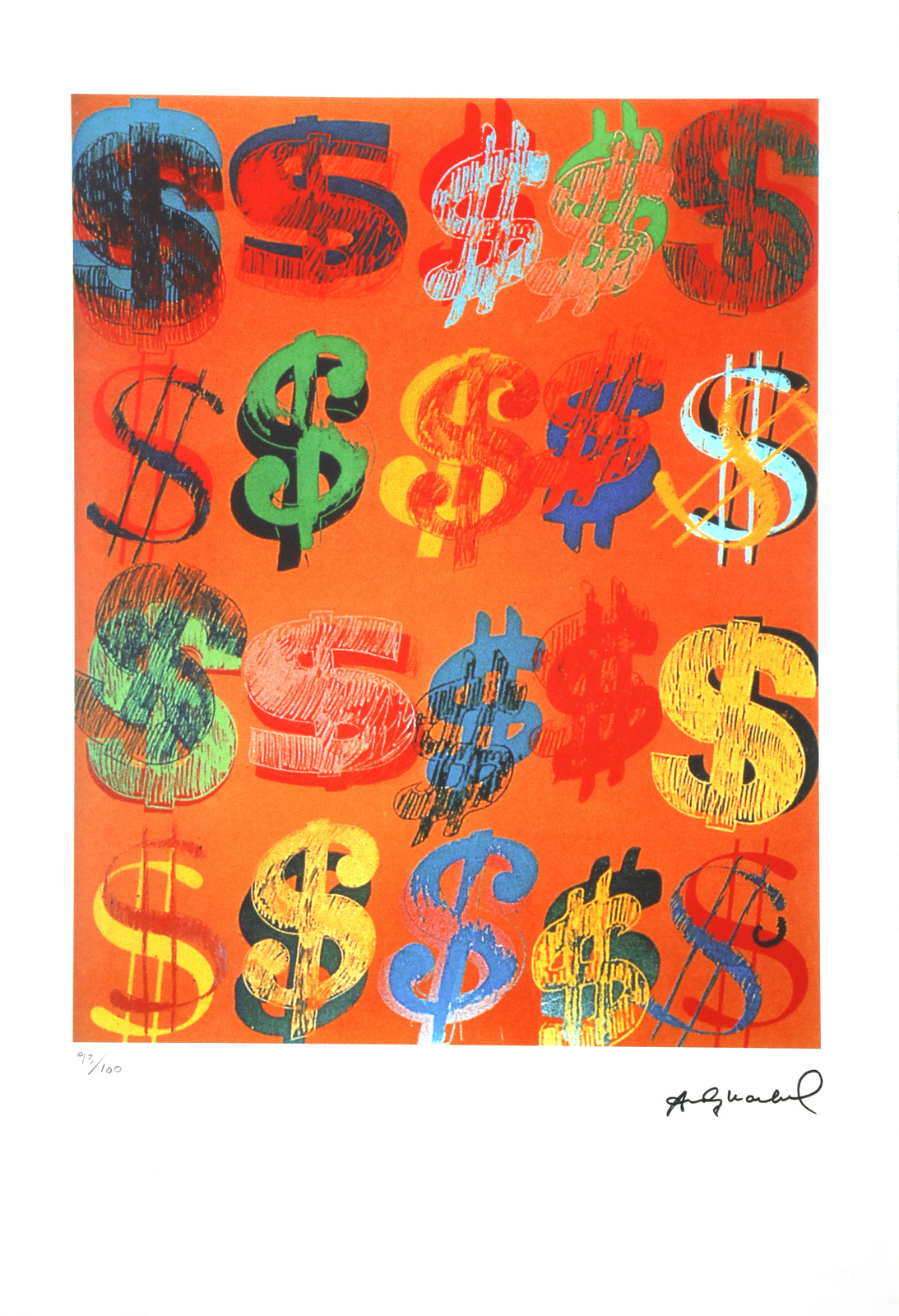 WARHOL ANDY (1928 - 1987) Lotto composto da n.4 fogli. Litografia. Cm 37,00 x 57,00. 1. Twenty dollar: 93/100. Tiratura a matita in basso a sinistra, firma a stampa in basso a destra. Carta Arches, France, timbro George Israel, Paris. Al retro timbri Leo Castelli, New York.