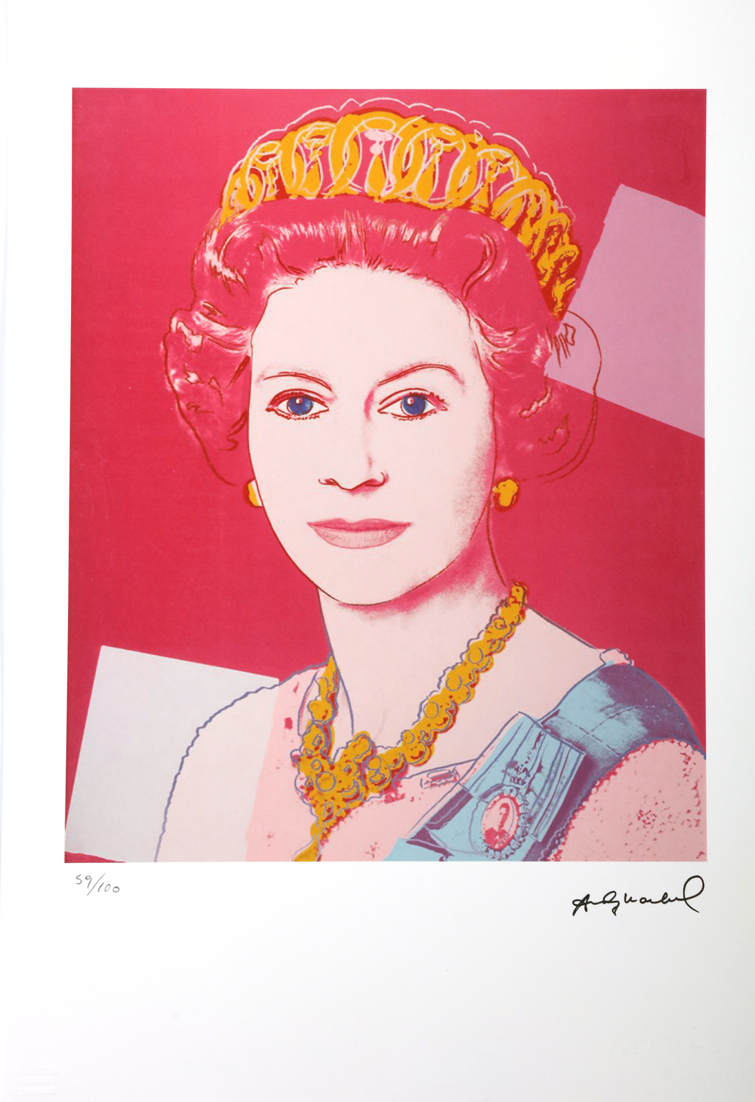 WARHOL ANDY (1928 - 1987) Lotto composto da n.4 fogli. Litografia. Cm 37,00 x 57,00. 1. Queen Elizabeth II: 59/100. Tiratura a matita in basso a sinistra, firma a stampa in basso a destra. Carta Arches, France, timbro George Israel, Paris. Al retro timbri Leo Castelli, New York.