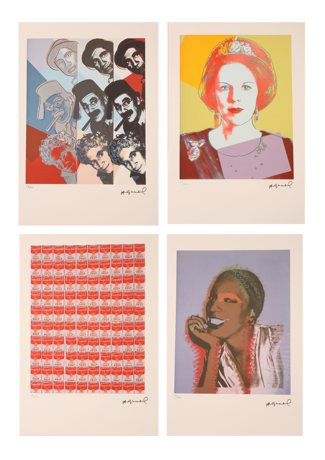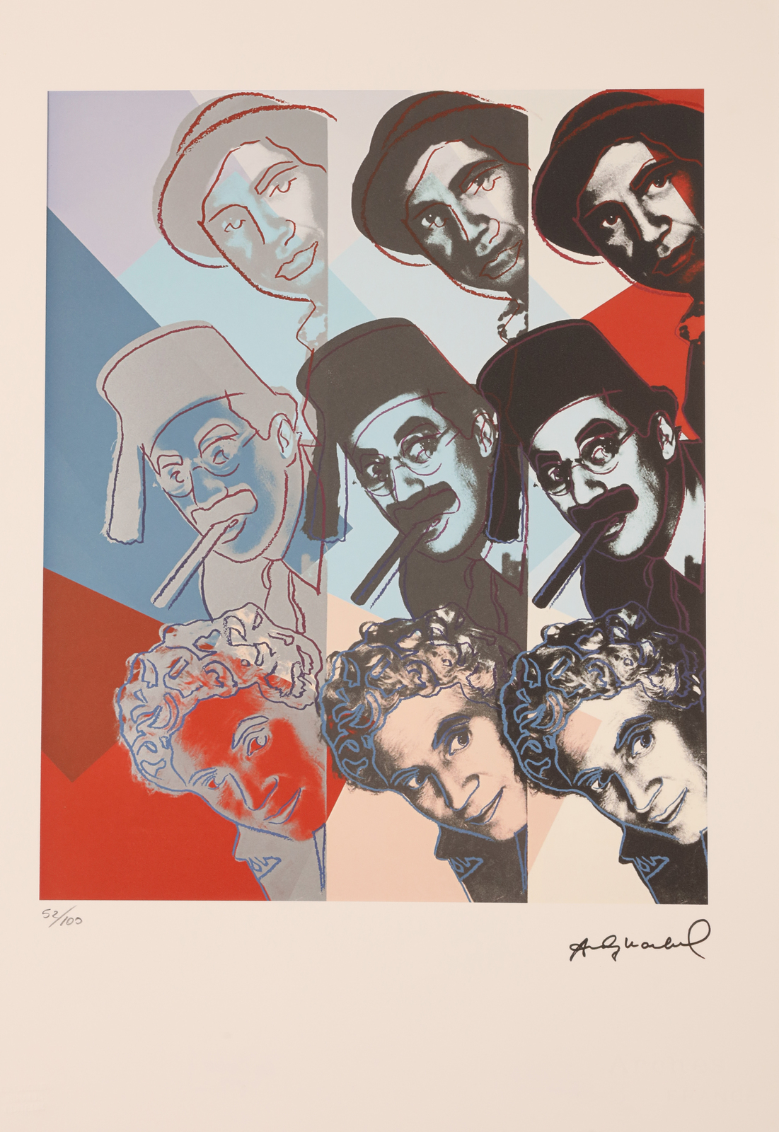 WARHOL ANDY (1928 - 1987) Lot composed of 4 sheet. Lithograph. Cm 37,00 x 57,00. 1. Marx brothers: 52/100. Edition lower left in pencil and signature lower right in print. Arches paper, France; George Israel, Paris samps. At the back Leo Castelli New York stamps.