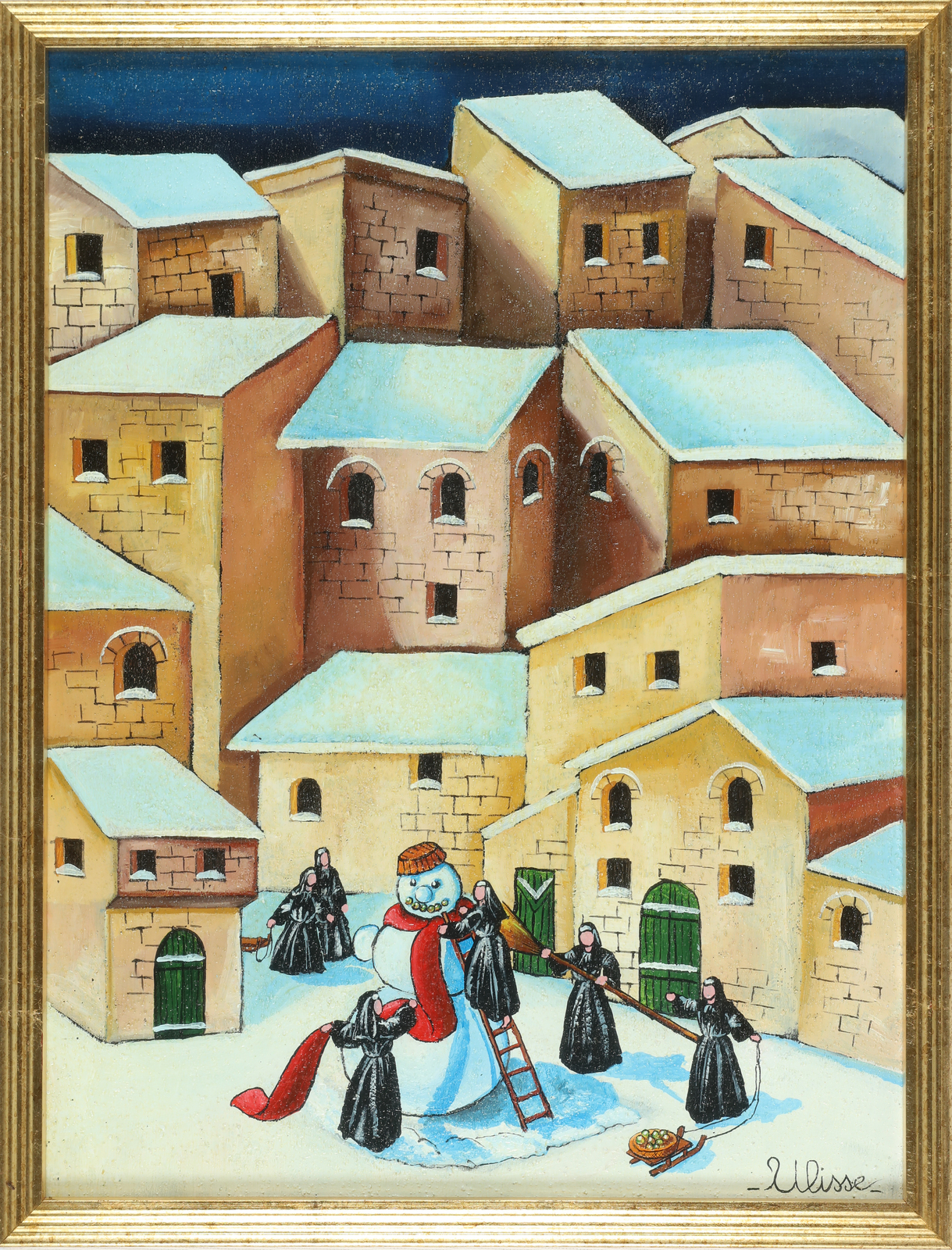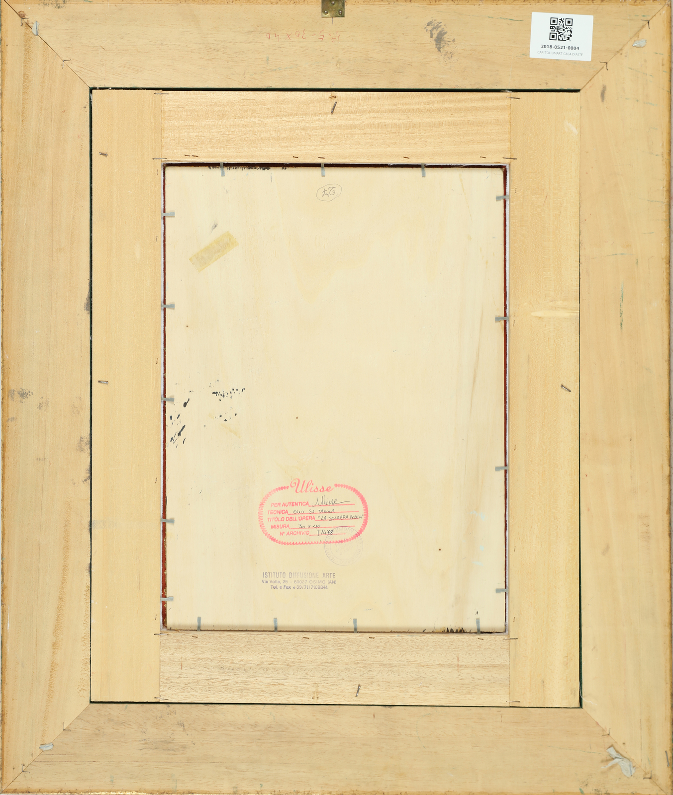 ULISSE (n. 1957) La sciarpa rossa. Olio su tavola. Cm 30,00 x 40,00. Firma in basso a destra. Al retro timbro dell'artista e timbro Istituto diffusione arte, Osimo. Cornice presente
