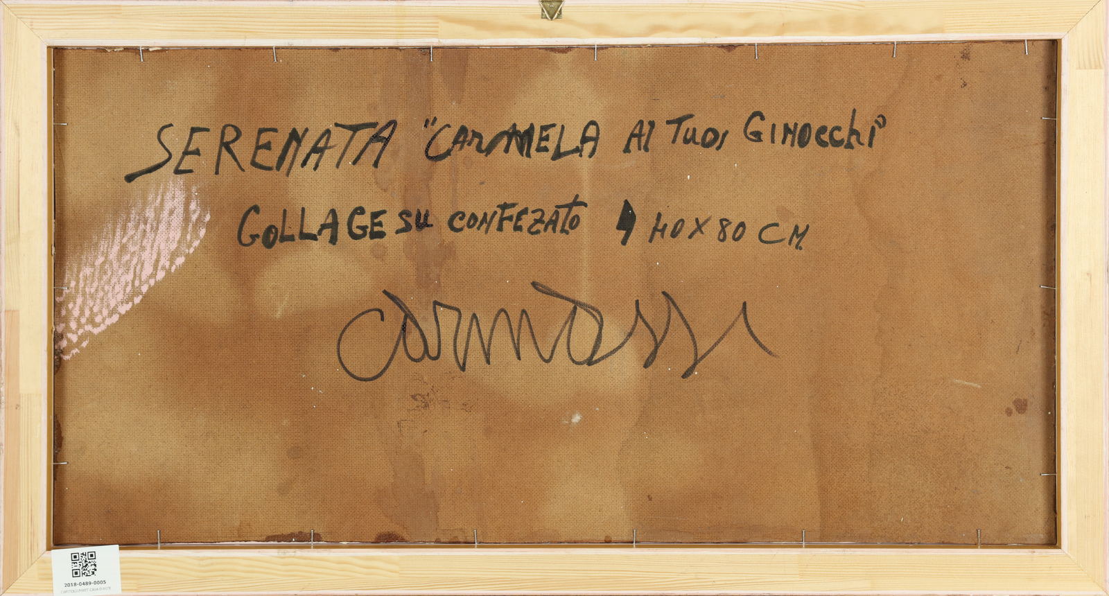 CARMASSI ARTURO (n. 1925) Serenata. Tecnica mista su faesite. Cm 80,00 x 40,00. Al retro titolo e firma. Autentica dell'artista su fotografia. Cornice presente