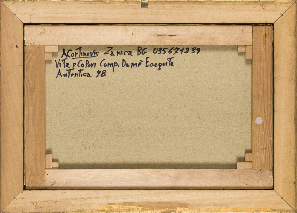 Dichiarazione di autenticità dell'Artista, titolo, datazione e località (Zanica) al retro