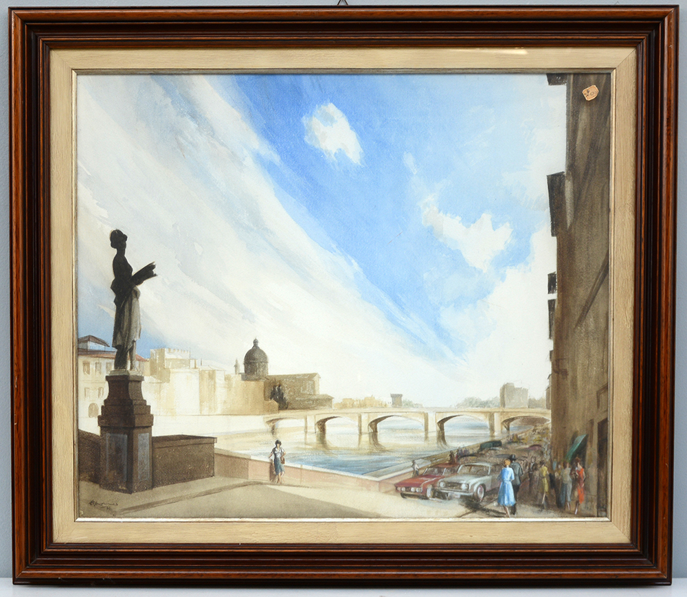 Ignoto "Veduta di Firenze" 1975 acquerello su carta (cm 53x63) firmato "Thomas" e datato in basso a sinistra. In cornice