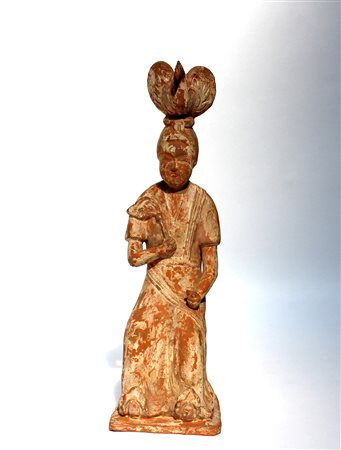 Manifattura cinese Scultura in terracotta raffigurante dama con ventaglio...