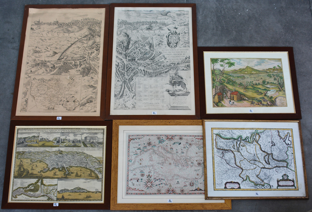 Lotto di sei riproduzioni di mappe e vedute di città, in cornici (difetti)