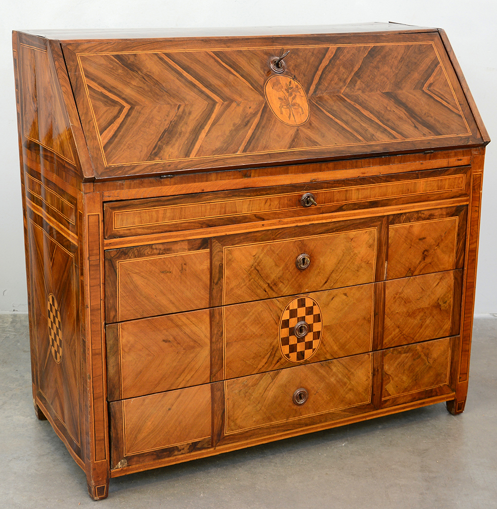 Antica ribalta con anta celante vani e cassettini. Fronte a tre cassetti e mezzo decorato a intarsi e filettature in legni vari (cm 124x118x67) (restauri e mancanze)