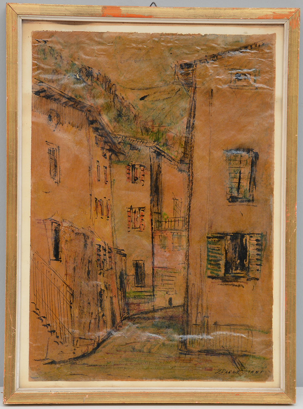 Parmeggiani "Scorcio di paese" tecnica mista su carta (cm 44x31) firmata in basso a destra, in cornice