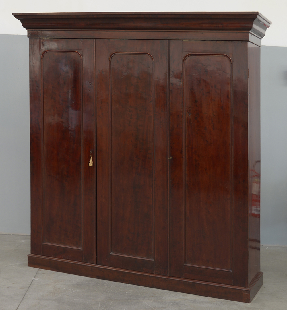 Armadio guardaroba inglese in mogano a tre sportelli pannellati celanti cassetti e piani amovibili porta camicie. Inghilterra, fine secolo XIX (cm 204x214x61) (lievi difetti)