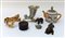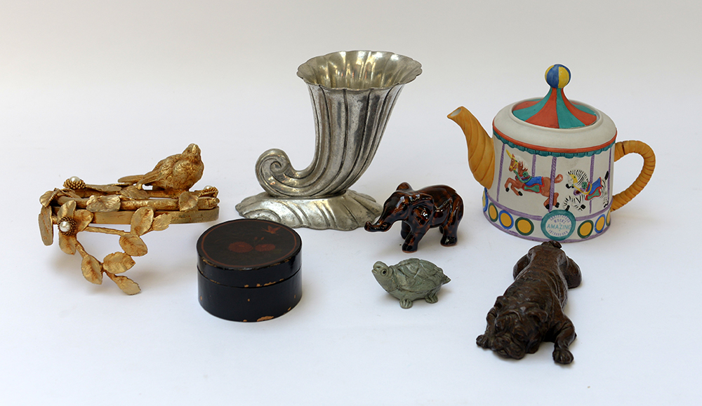 Lotto vario composto da una scatolina laccata nera, una teiera in ceramica raffigurante un carosello, tre sculturine a forme di animali, un vaso a cornucopia e un elemento decorativo in metallo dorato sormontato da uccellino e perle (difetti)