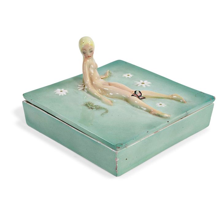 Scatola in ceramica con figura di fanciulla in rilievo.