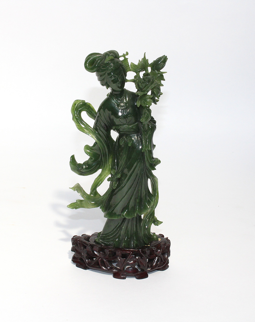 Scultura in pietra dura verde raffigurante dama dalle lunghe vesti, con base in legno (difetti) Cina, secolo XX (h.20,5 cm.)