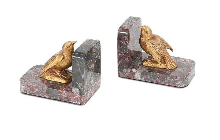 Coppia di fermalibri in marmo del Portogallo, decoro di due sculturine di passeri in bronzo dorato.