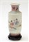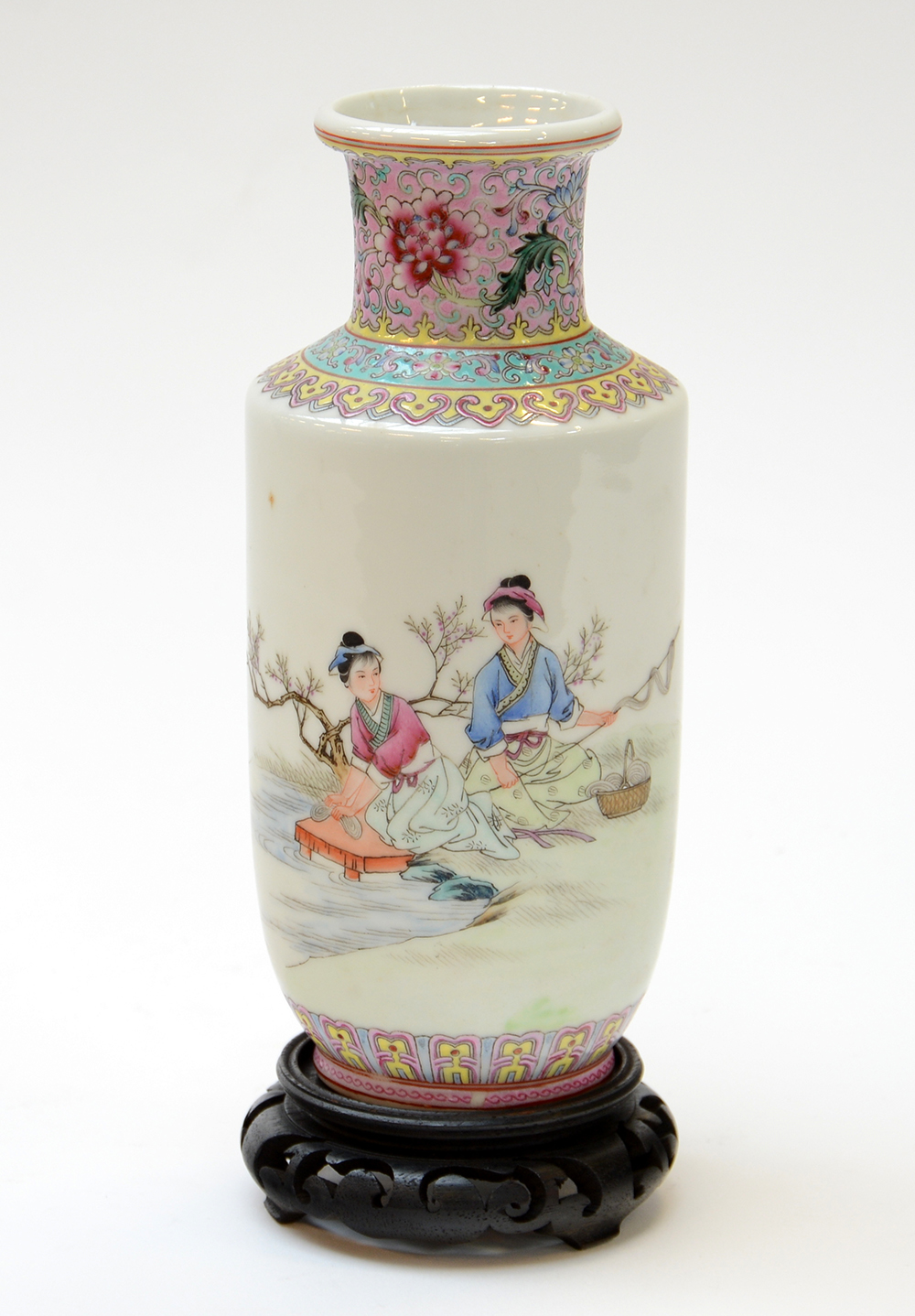 Piccolo vaso ruleau in porcellana Famiglia Rosa decorato con filatrici e iscrizione calligrafica, marchio apocrifo Qianlong alla base (lievi difetti) Cina, sec. XX (h. 21 cm.) -EN .