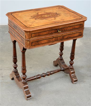 Tavolino da lavoro con gambe tornite, piano e fascia lastronati in radica di noce e intarsiati (cm 56x65x41) (difetti)