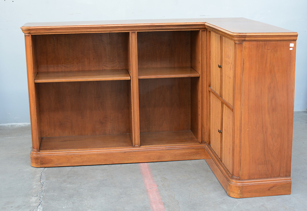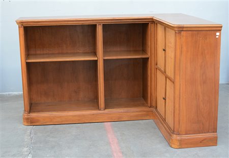 Libreria d'angolo in legno dolce con vani a giorno e pannelli scorrevoli (difetti)