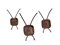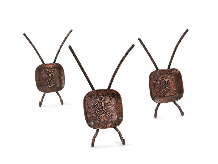 Tre attaccapanni in rame massiccio con formelle centrali in rame sbalzato a figure stilizzate.