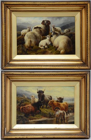 Robert Watson (1865 - 1916) "Paesaggi con armenti" 1898, coppia di dipinti ad olio su tela (cm 40x60) firmati e datati in basso a destra. In cornici
