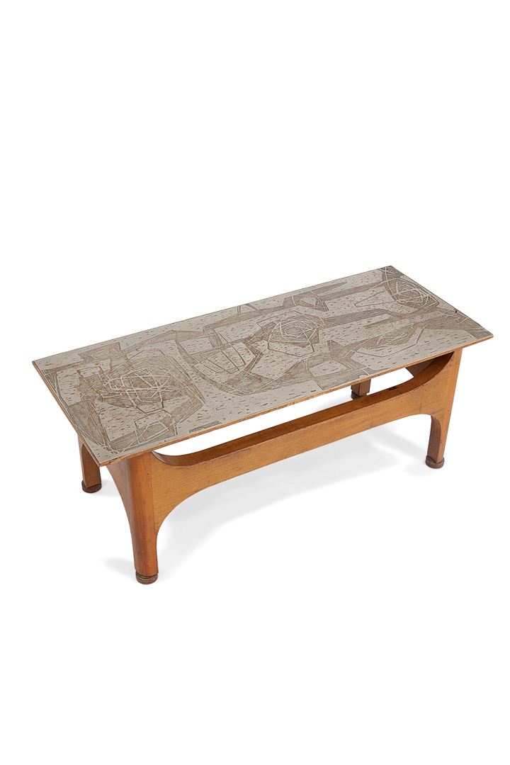 Tavolino con piano in lamiera di zinco inciso ad acido e base in legno. Firmato Giambarale.