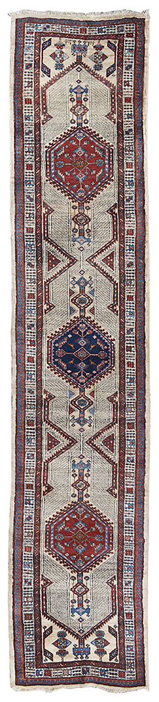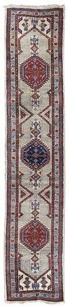Tappeto Sarab, Passatoia, Persia, inizio secolo XX. Decoro a tre medaglioni esagonali, i due esterni rossi e quello centrale blu, su fondo in lana cammello decorato da motivi geometrici marrone scuro a righe parallele diagonali nel senso dei lati dell'esagono. I medaglioni ed i loro puntali sono decorati con simboli stilizzati, nei toni dell'azzurro, rosso, marrone e rosa. Bordura con decoro geometrico su campo bianco. (cm 465x100) (lievi difetti) -EN Early 20th century Sarab runner. Three medallions on camel hair ground. Iran. (cm 465x100)(minor damages).
