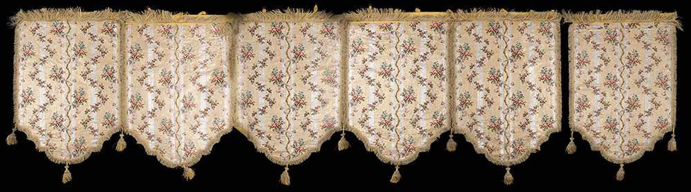 Lampasso laminato e broccato in oro e argento, Francia, secolo XVIII. Paramento a sei teli festonati con fiocco. I pannelli sono confezionati con un raro e ben conservato tessuto lampasso in seta, decorato a meandro con mazzolini di fiori di seta policromi con applicazioni e broccati in argento, legati da un nastro di pizzo in argento, alternato ad un motivo a meandro con un ramo verde fiorito che lega bouquet di fiori con asola e di maggiori dimensioni. Il fondo su cui poggia il decoro è completamente laminato in oro con righe intercalate laminate in argento. (cm 77x53) (conservazione ottima) -EN 18th century gold and silver laminated lampas. Decorated with meander pattern of flowers bouquets on gold foundation with silver rows. France.(cm 77x53)(mint conditions).